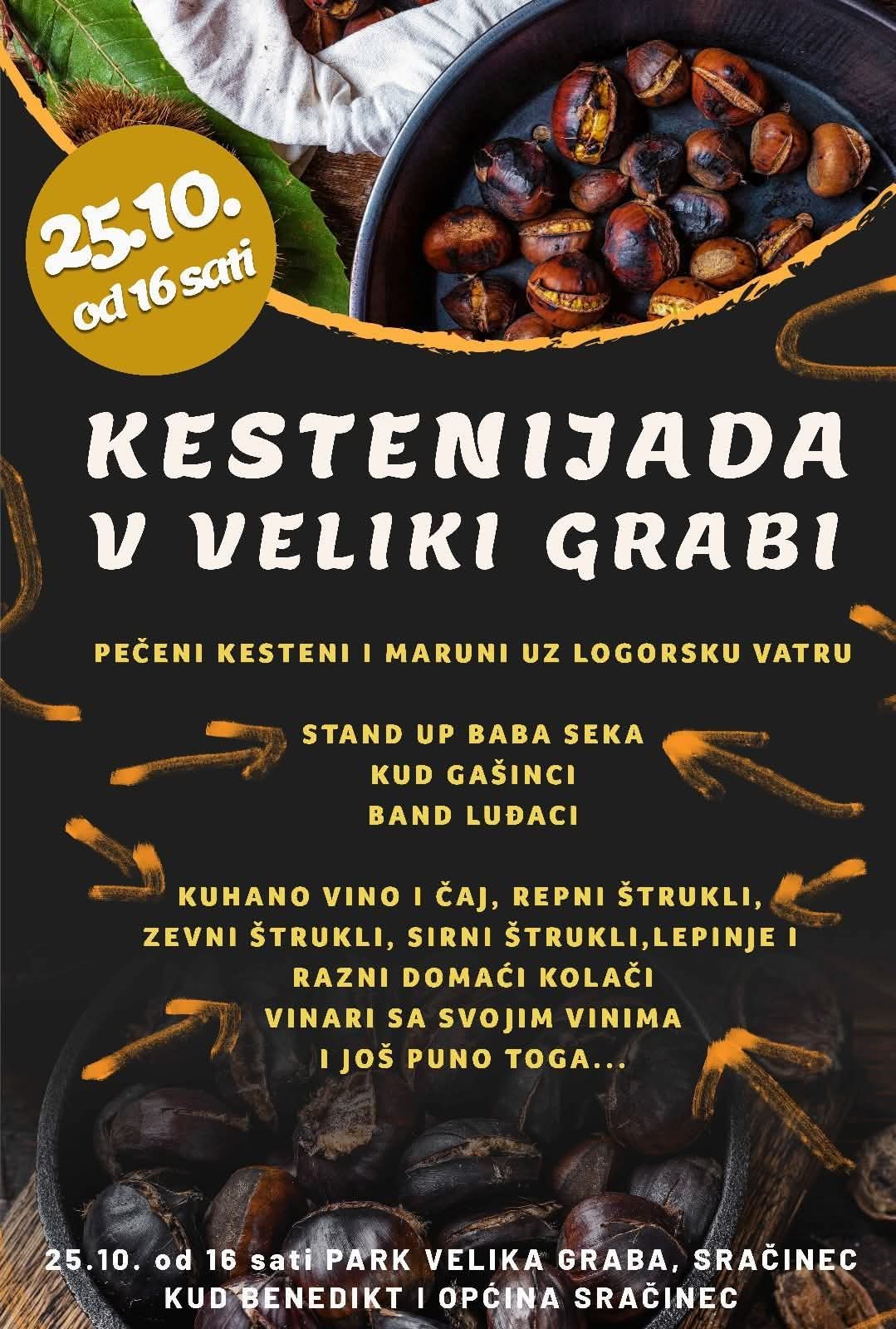 U subotu, 25. listopada 2025. godine, s početkom u 16 sati, u Parku Velika Graba u Sračincu održat će se tradicionalna manifestacija „Kestenijada v Veliki Grabi“.