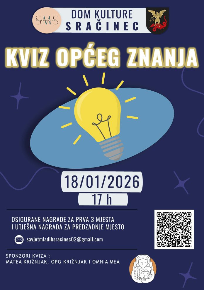 Savjet mladih Općine Sračinec poziva sve ljubitelje znanja, druženja i dobre atmosfere na kviz općeg znanja, koji će se održati u nedjelju, 18. siječnja 2026. godine, s početkom u 17 sati, u Domu kulture Sračinec.