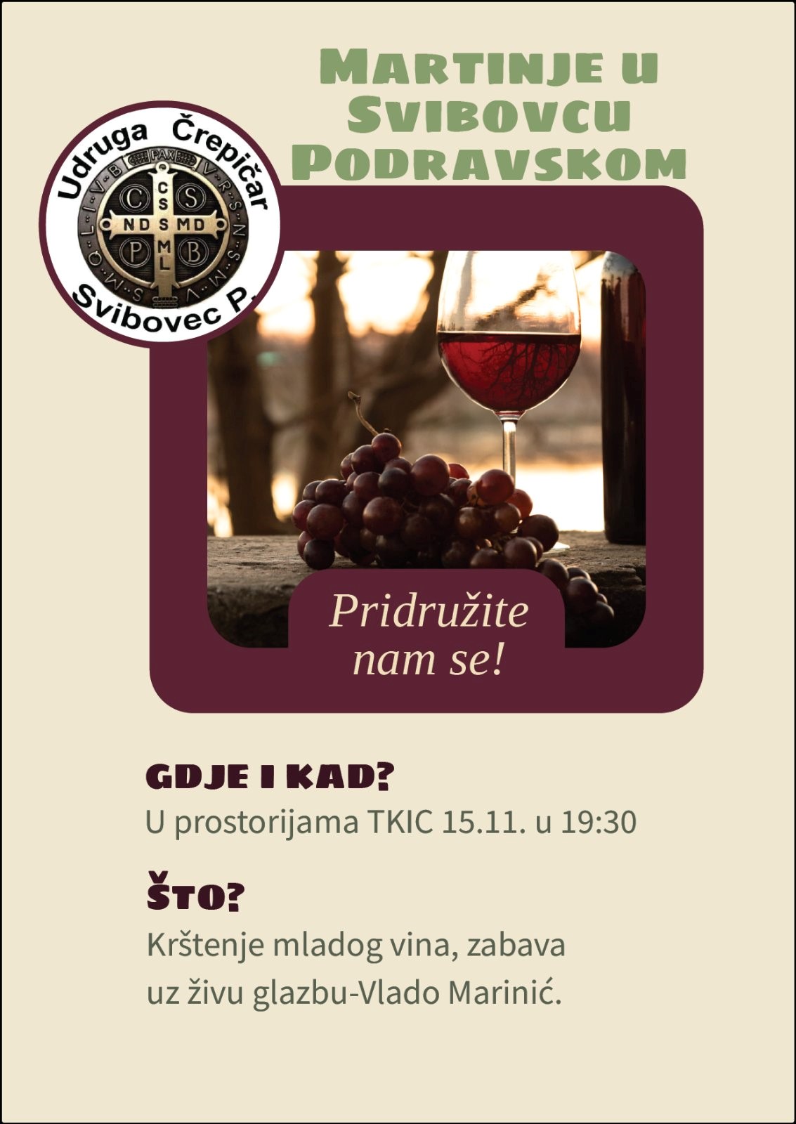 Udruga Črepičar Svibovec Podravski poziva sve mještane i goste na tradicionalno obilježavanje Martinja u Svibovcu Podravskom, koje će se održati 15. studenoga s početkom u 19:30 sati u prostorijama TKIC-a.