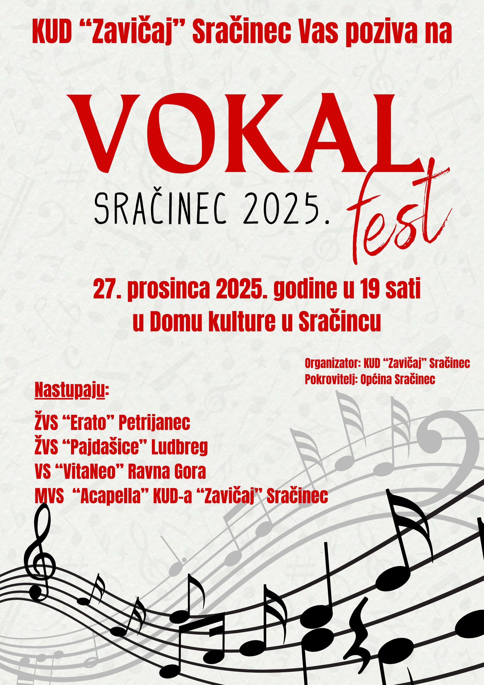 Mješoviti vokalni sastav Acapella Sračinec s ponosom najavljuje 2. VOKALfest u Sračincu – večer ispunjenu vrhunskom vokalnom glazbom, zajedništvom i pozitivnom energijom!